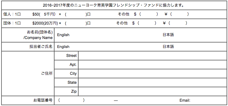 そこで、その資金作りのために、1993年 夏、フレンドシップファンドを設立致しました。現在のようなリセッションの経済状態の中で、誠に心苦しく存じますが、将来、必ずや日米の架け橋となり、世界のために活躍する子供達のために、ニューヨーク育英学園の教育にご理解頂き、ニューヨーク育英学園『フレンドシップ・ファンド』への温かい御支援を賜り ますよう学園を代表してお願い申し上げます。